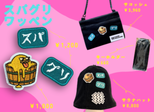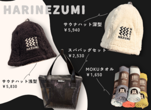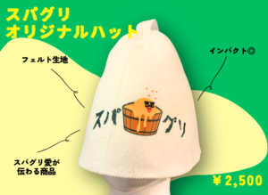 | ・スパグリ オリジナルサウナハット ¥2,500 ・neco sauna サウナハット ¥4,900 ・HARINEZUMI サウナハット浅型 ¥5,830 ・HARINEZUMI サウナハット深型 ¥5,940 ・HARINEZUMI スパバッグセット ¥2,530 ・HARINEZUMI MOKUタオル ¥1,650 ・スパ・グリ ワッペン ¥1,200 ・キャラクター ワッペン ¥1,000 ・サコッシュ ¥3,960 ・キーホルダー ¥660 ・サウナハット ¥8,800 |